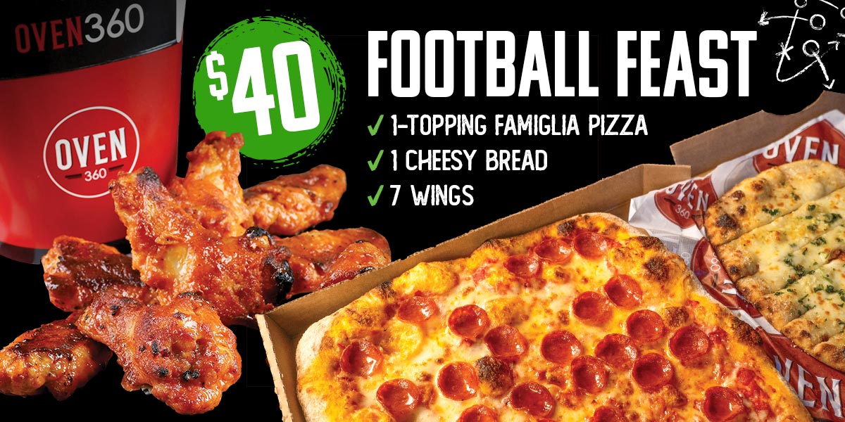 Get any 1-topping famigilia pizza, 1 cheesy bread, and a 7-piece order of wings for just $40. Available for a limited time only.